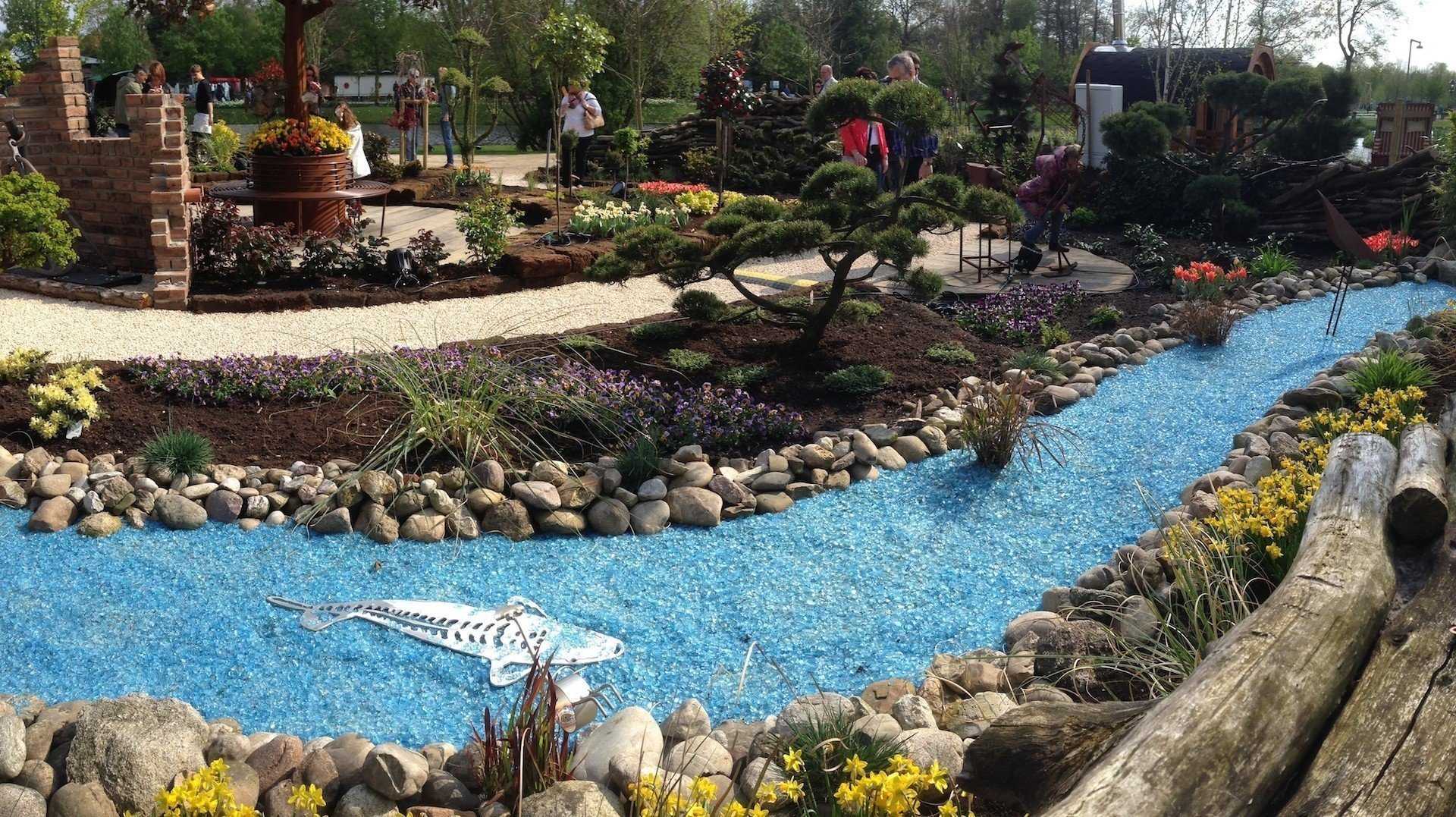 Wat er wel veel was, was kitch, maar dan ook echt veel kitch. Ik dacht dat de tuinkabouter en aanverwanten wel uitgerangeerd waren inmiddels, maar in Duitsland zijn ze populairder dan de nieuwste iPhone. Kunst van de hoogste plank waren nog wel de beschilderde schuttingplanken – zucht – die volgens hen echt overal mee te combineren zijn. Zelfs in een Japanse tuin, zoals gietijzeren kitch ook prima passen temidden van vormbomen?! Blauw glas als siergrint symboliseert het water met zelfs – jawel – een Koi vorm.