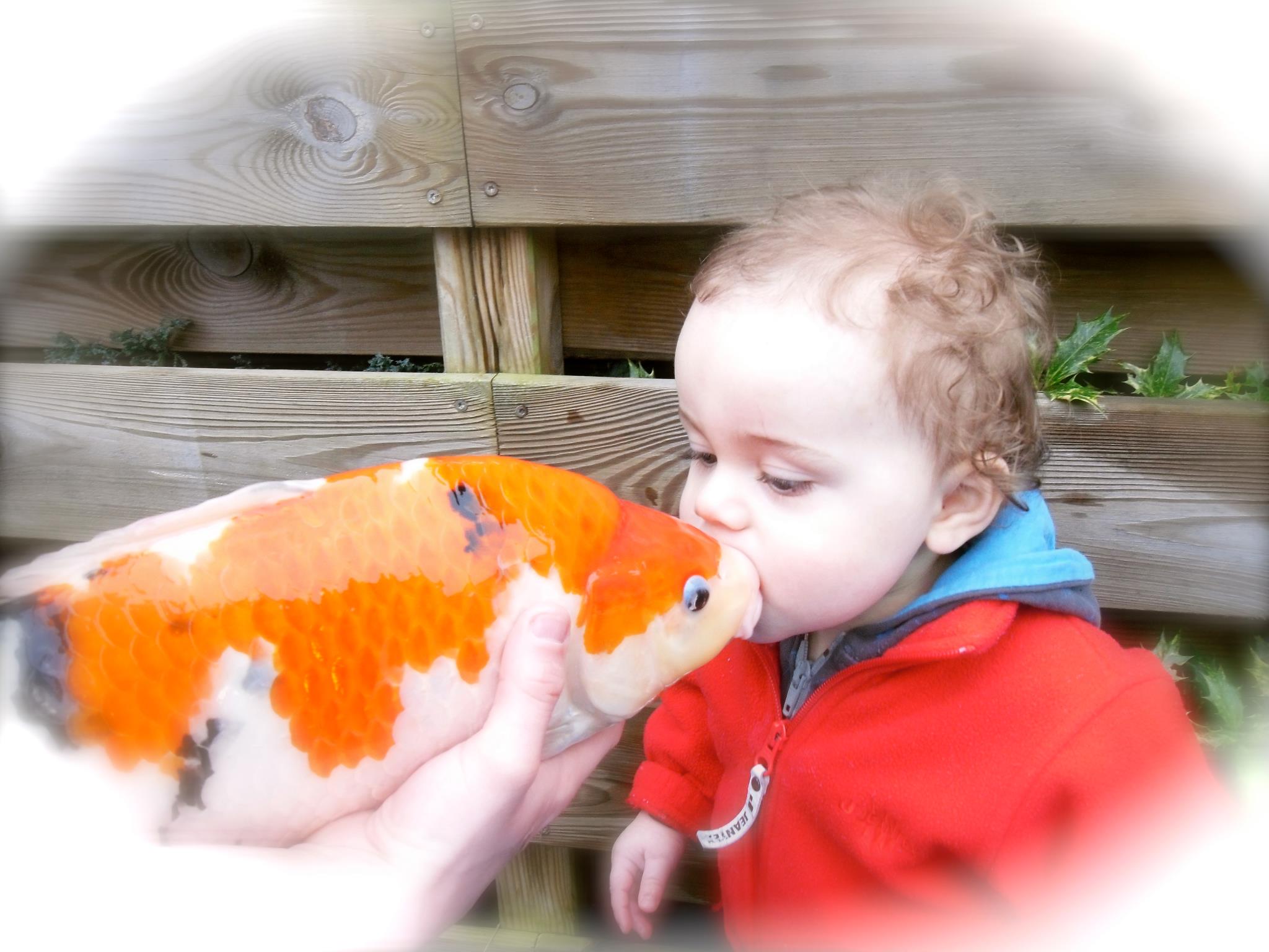 Knap hoor dat hij al Koi kan zeggen! Hier horen we elke keer “ish!” als hij een vis voorbij ziet zwemmen
