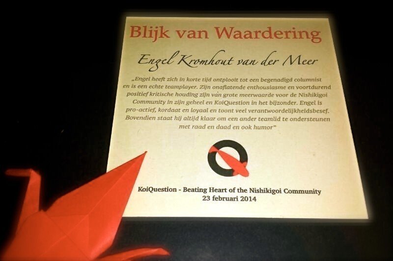 Best essentieel en ook veel vergend dus. Jeroen heeft dit ruim twee jaar met veel plezier gedaan. Zelf schreef hij hierover nog een blog die een dezer dagen op KoiQuestion zal verschijnen. Tijdens de bijeenkomst werd er uitgebreid stil gestaan bij dit afscheid en ik mocht aan Jeroen een Blijk van Waardering uitreiken die veelzeggend is;