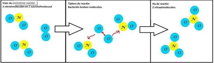 Bij een chemische reactie ga je moleculen breken. Een molecuul wordt gekraakt in losse bouwstenen, oftewel de atomen. De losse bouwstenen vormen nieuwe groepjes, dus nieuwe moleculen. Een atoom verdwijnt nooit. Elke atoom vormt een nieuw molecuul. In de filter en vijver doen nuttige bacteriën dit werk voor ons. Een voorbeeld is de omzetting van nitriet in nitraat. De bacteriën plakken aan een nitrietmolecuul een extra zuurstofatoom. Dit is fijn voor de Koi, omdat nitriet giftig is voor de vissen.