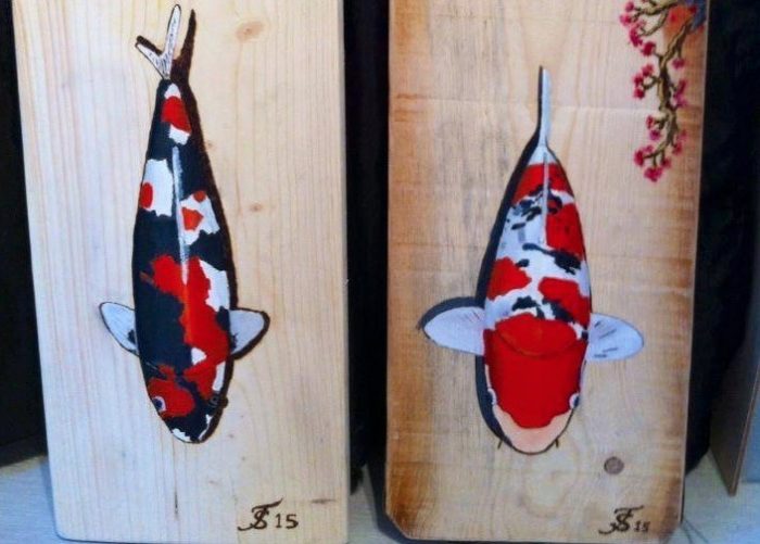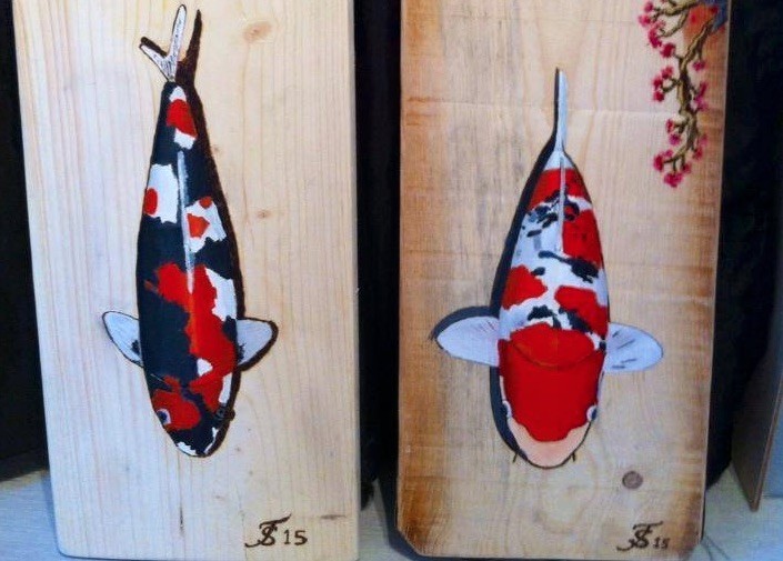 Voor Martin is de Sanke genaamd ‘The One’ die hij aankocht bij Floors Koi Shop een zeer speciale; beslist een kampioen. Toen Martin afgelopen weekend bij Sergio op visite kwam, wachtte hem een verrassing. Sergio, die al vaker en op meer fronten artistieke vaardigheden heeft getoond met altijd Koi als onderwerp, heeft speciaal voor Martin zijn Sanke op hout gemaakt. Het voelt goed voor Sergio dat hij iets terug kan doen. De kunstwerken zijn door Sergio gemaakt door eerst de contouren in het hout te branden en deze vervolgens te beschilderen. In ieder werk laat hij ook een bonsai-tak terugkomen.