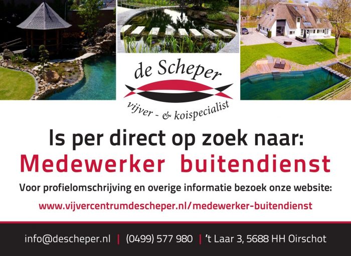 Voor het uitbreiden van het team bij De Scheper, Vijver- en Koispecialist, zijn we per direct op zoek naar een medewerker voor de buitendienst.